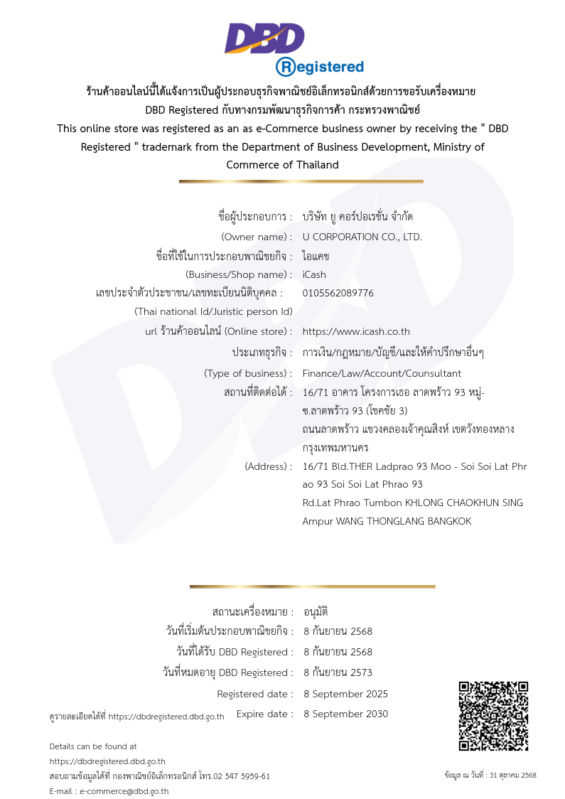เรามุ่งมั่นให้ลูกค้ามั่นใจได้ว่าทุกขั้นตอนของการใช้บริการกับ iCash มีความปลอดภัย ถูกต้องตามกฎหมาย และสามารถตรวจสอบได้ในทุกขั้นตอน